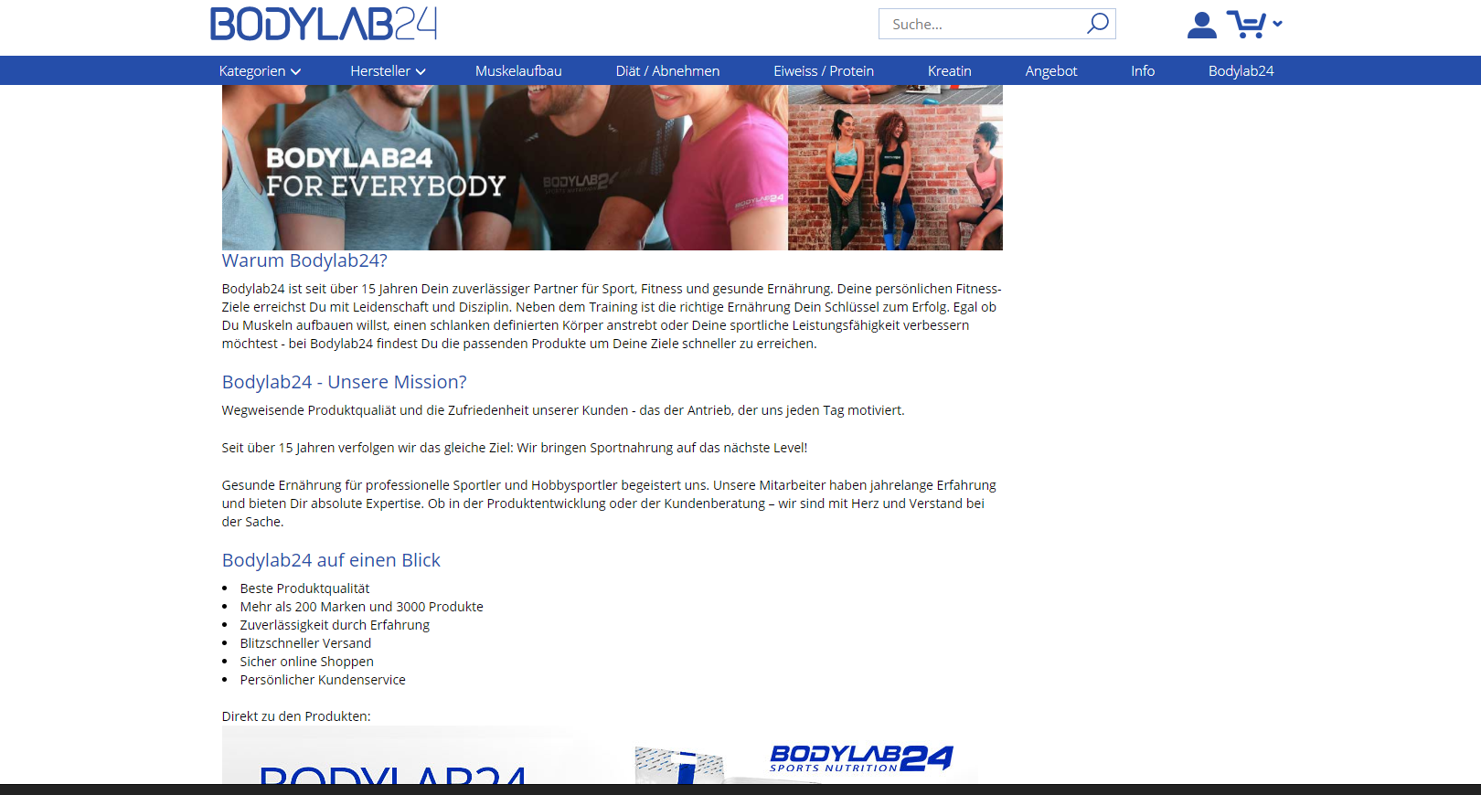 Bodylab24 ist seit 15 Jahren Anbieter für Sporternährung und Supplemente. Durch die Erfahrung und die hohe Qualität der Produkte hat sich Bodylab24 über die Jahre bewährt. Unter den Herstellern befinden sich namenhafte Marken wie Wieder, ZecPlus und IronMaxx. Die Unternehmensphilosophie von Bodylab24 ist es, gesunde Ernährung für Sportler und Hobbysportler zu fairen Preisen und hoher Qualität anzubieten.
