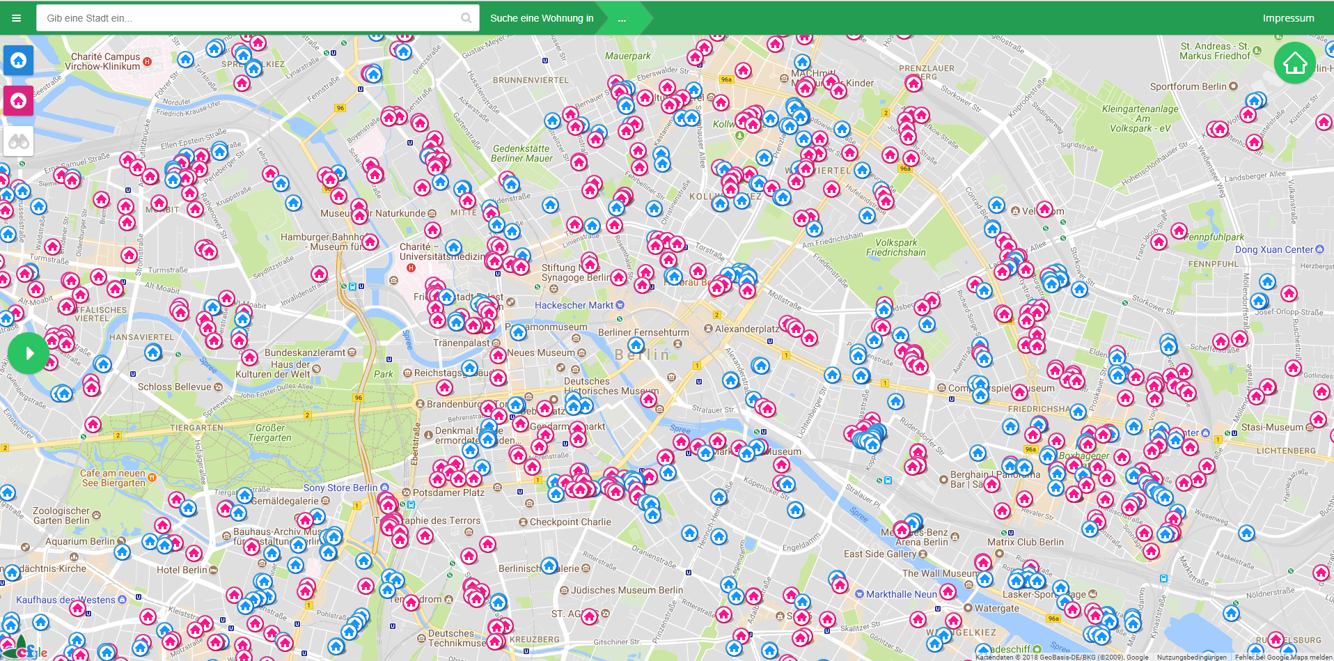 Bei cherryflats.de kann man nach Immobilien suchen, indem man auf der angezeigten Karte ein bestimmtes Gebiet auswählt. Anschließend werden alle verfügbaren Immobilien in diesem Bereich angezeigt. Dadurch wird die Wohnungssuche erheblich erleichtert. Es gibt Immobilien zum Kaufen und zum Mieten für ganz Deutschland. Findet man eine ansprechende Lage, so kann man einfach auf das Haus-Symbol klicken und sich dann verschiedene Informationen zu der Immobilie anzeigen lassen. Außerdem stehen Filteroptionen wie Kauf- und Mietpreis, Größe und Zimmeranzahl zur Verfügung.