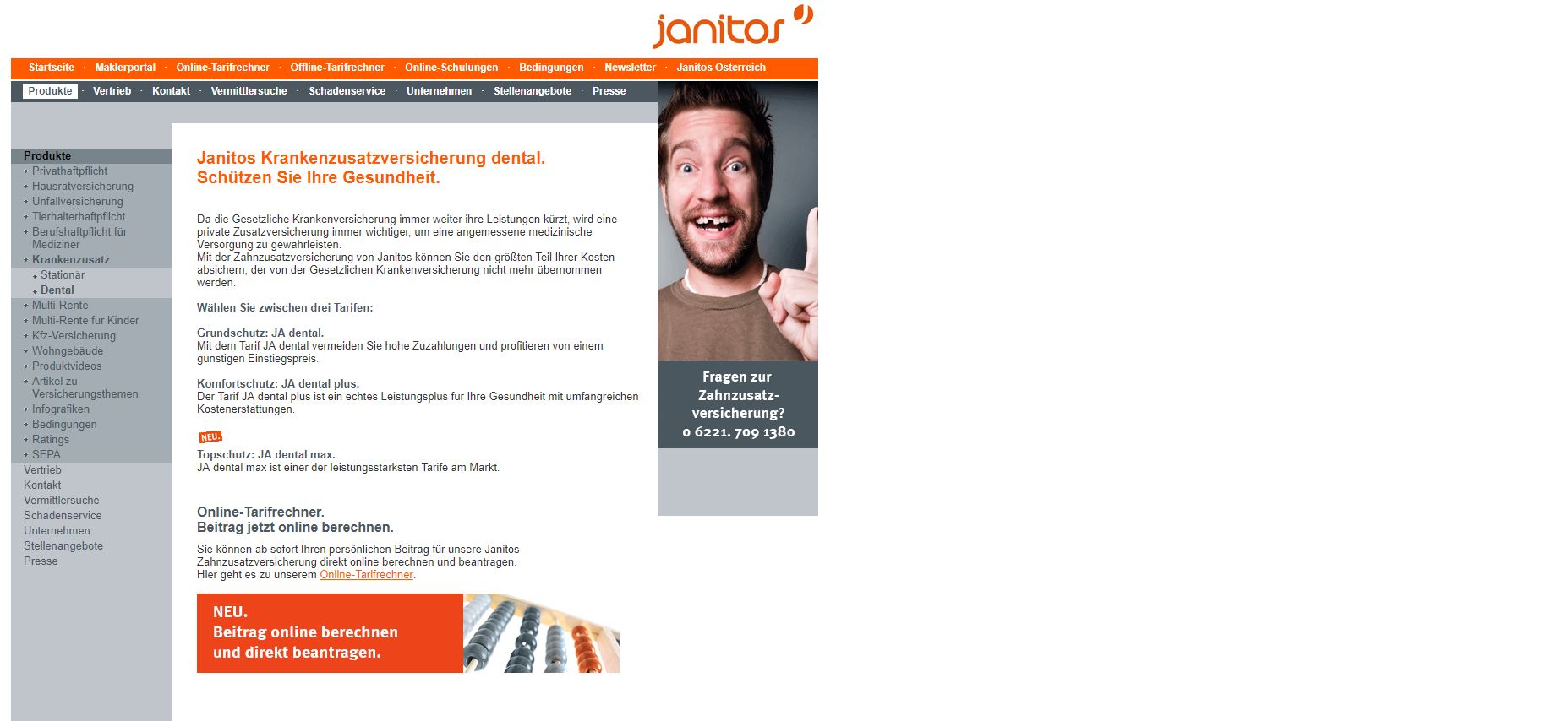 Die Janitos Zahnzusatzversicherung bietet drei Tarife zur Auswahl. Die Versicherungen können den größten Teil der Kosten bei Zahnbehandlungen, die von der gesetzlichen Krankenversicherung nicht mehr übernommen werden, abdecken. Je nach Tarif setzt sich der Prozentsatz der Kostenübernahme, sowie die Höhe der monatlichen Beiträge zusammen. Des Weiteren variiert die Wartezeit der einzelnen Tarife zwischen 8 Monaten und keiner Wartezeit, beispielsweise im „JA dental max“-Tarif kann die zahnmedizinische Individualprophylaxe ohne Wartezeit in Anspruch genommen werden.